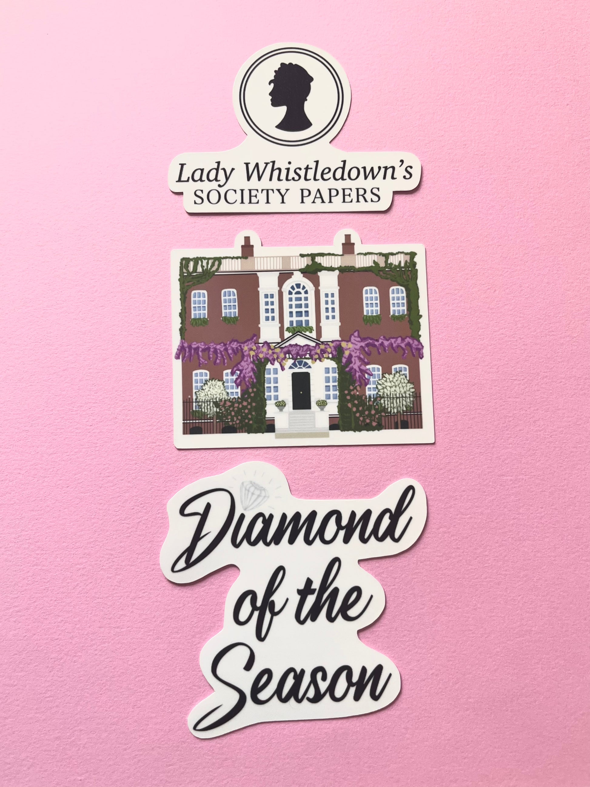 What a great way to show off your love for the Ton than with this Bridgerton Sticker Bundle. Featuring 3 stickers - Lady Whistedown's Society Papers, Bridgerton House and Diamond of the Season.
