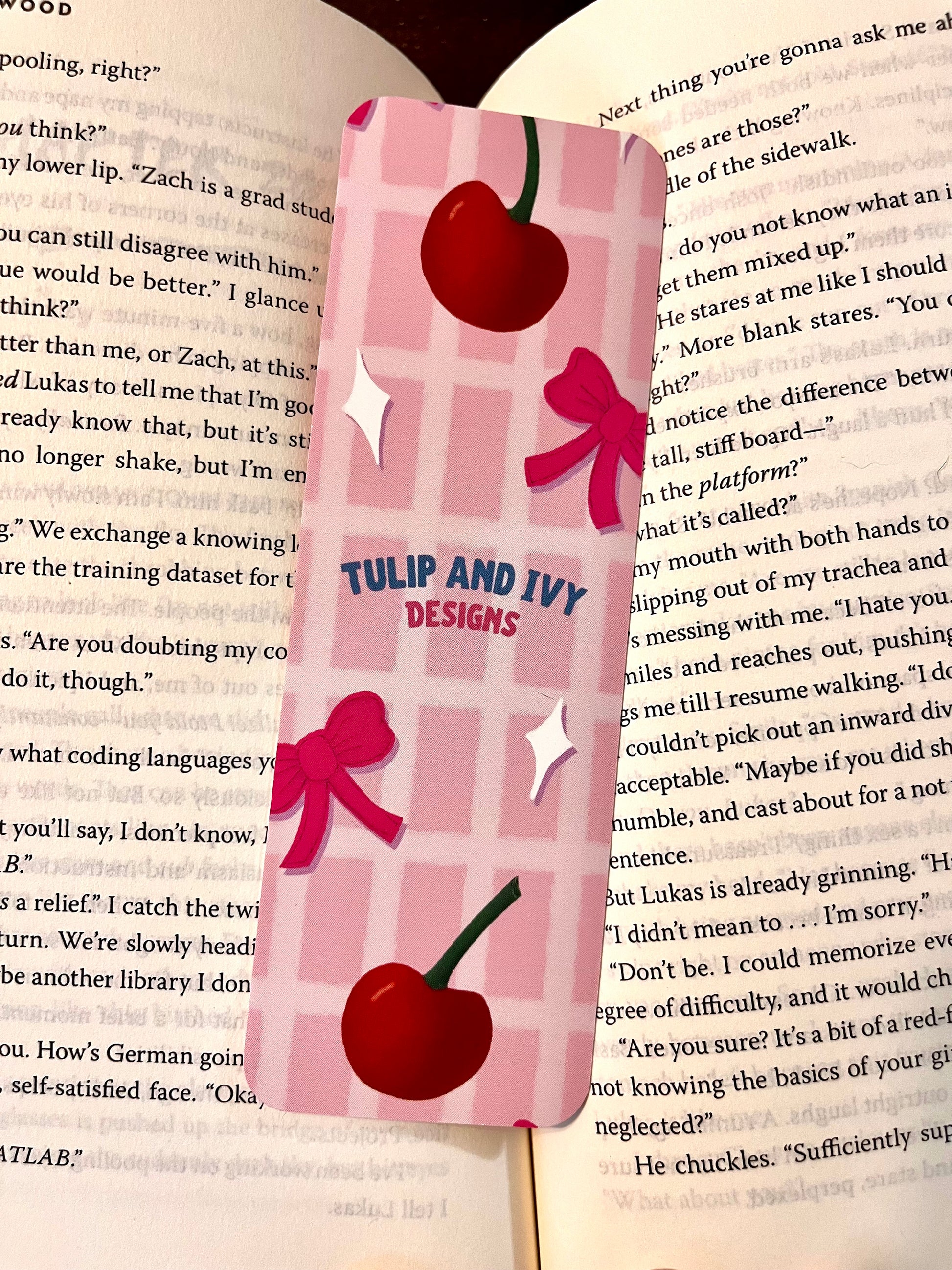 Add a little sugar and spice to your bookmark collection with this Cherries and Bows bookmark. The juicy cherries and demure pink bows sit against a pink gingham background.